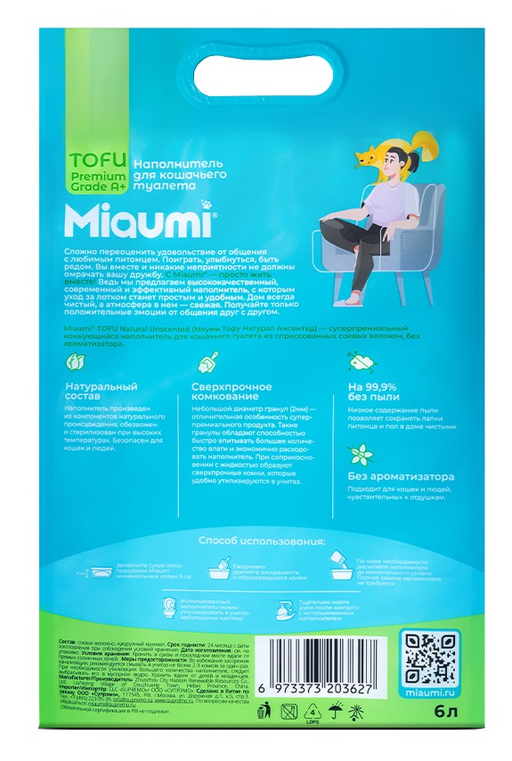 Miaumi® TOFU Natural Unscented – натуральный наполнитель для кошачьего туалета из спрессованных соевых волокон без ароматизатора.