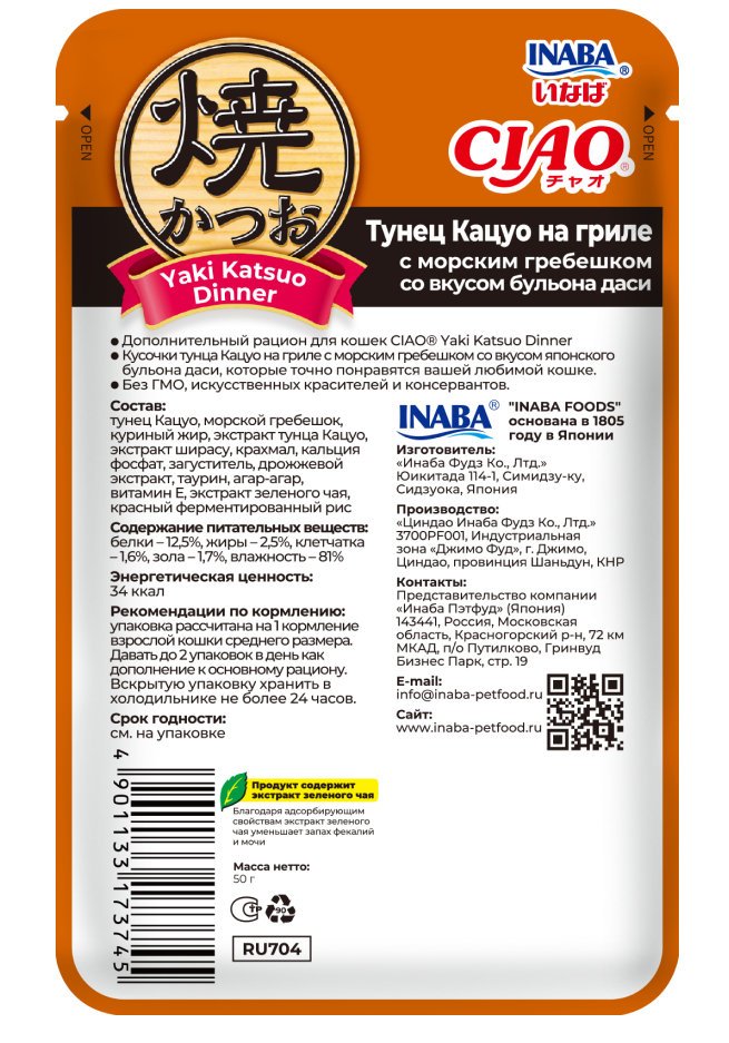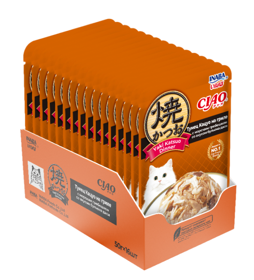 INABA. Yaki Katsuo Пауч для кошек. Тунец кацуо на гриле с морс.гребешком со вкусом бульона даси, 50г