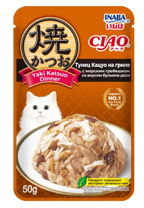 INABA. Yaki Katsuo Пауч для кошек. Тунец кацуо на гриле с морс.гребешком со вкусом бульона даси, 50г