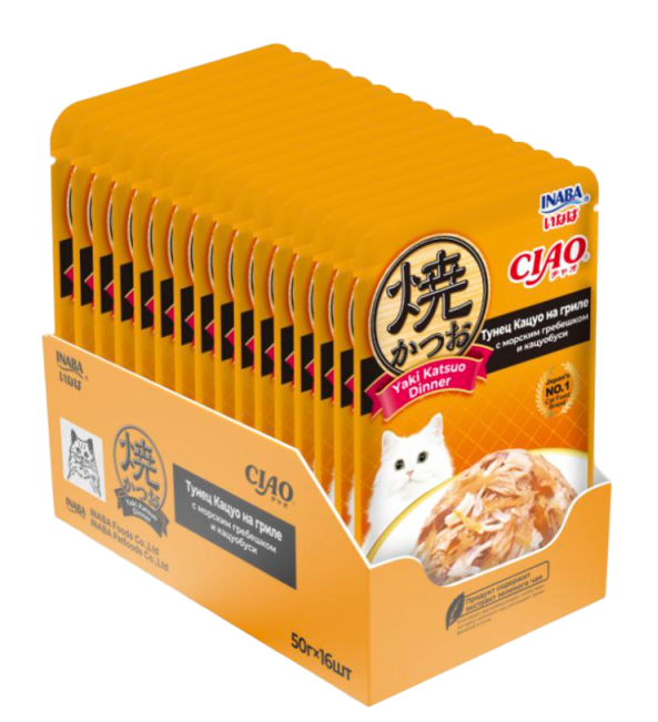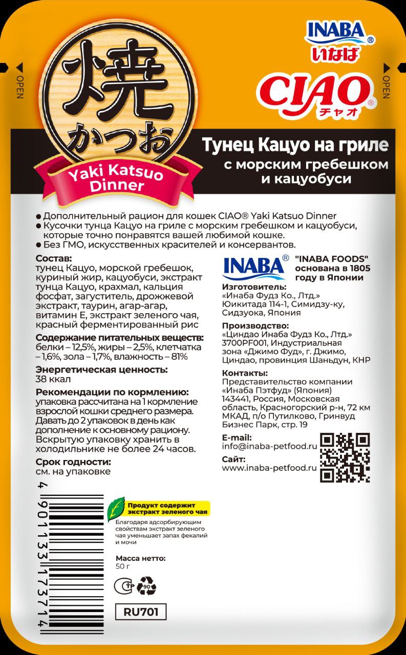 INABA. Yaki Katsuo Пауч для кошек. Тунец кацуо на гриле с морским гребешком и кацуобуси, 50г