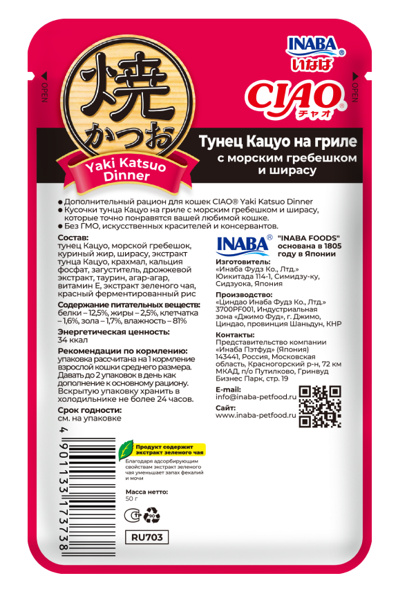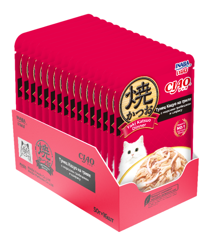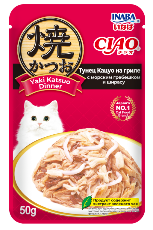 INABA. Yaki Katsuo Пауч для кошек. Тунец кацуо на гриле с морским гребешком и ширасу, 50г