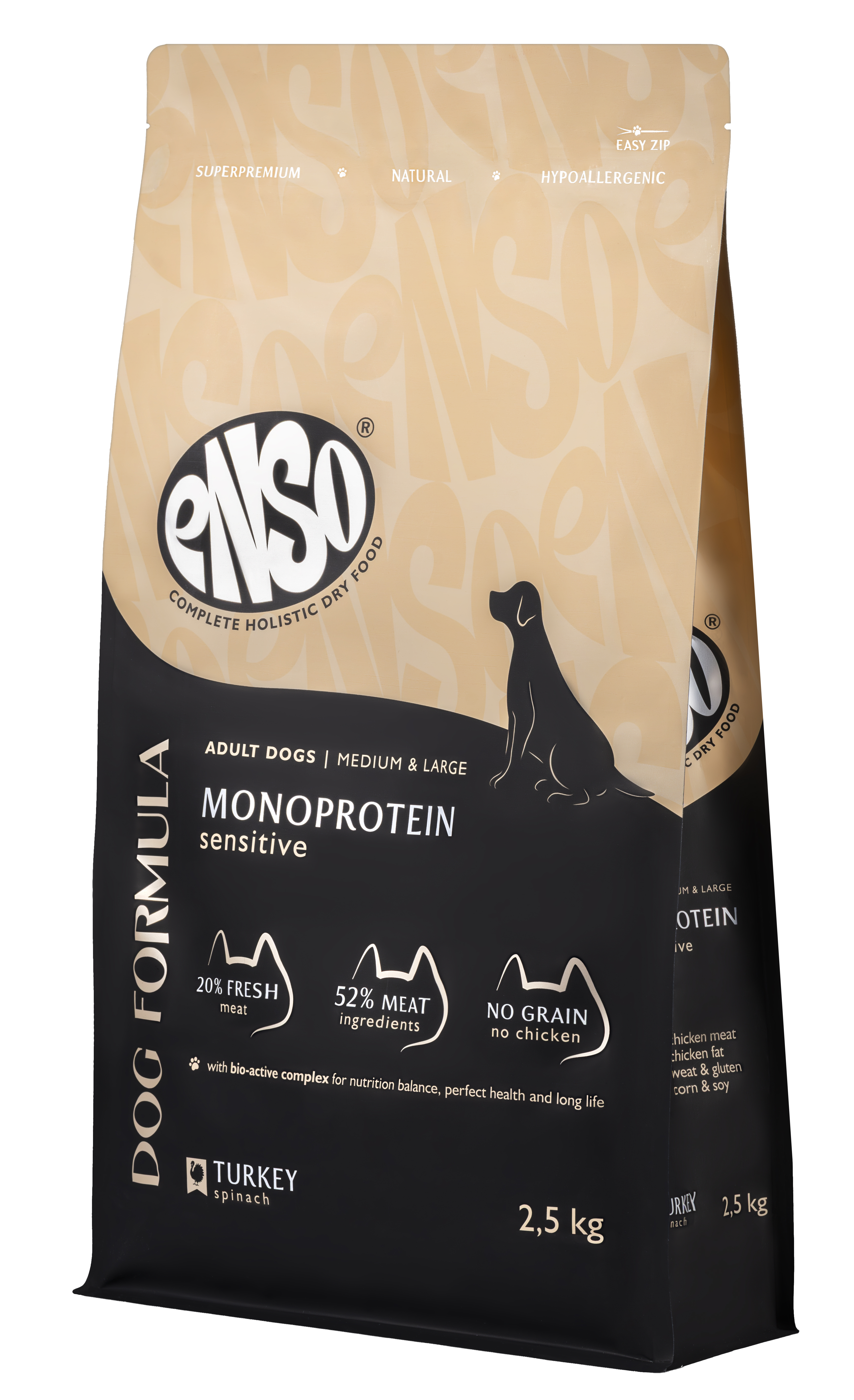 ENSO Dog formula Monoprotein сухой полнорационный корм для взрослых собак средних и крупных пород со свежей индейкой с добавлением шпината