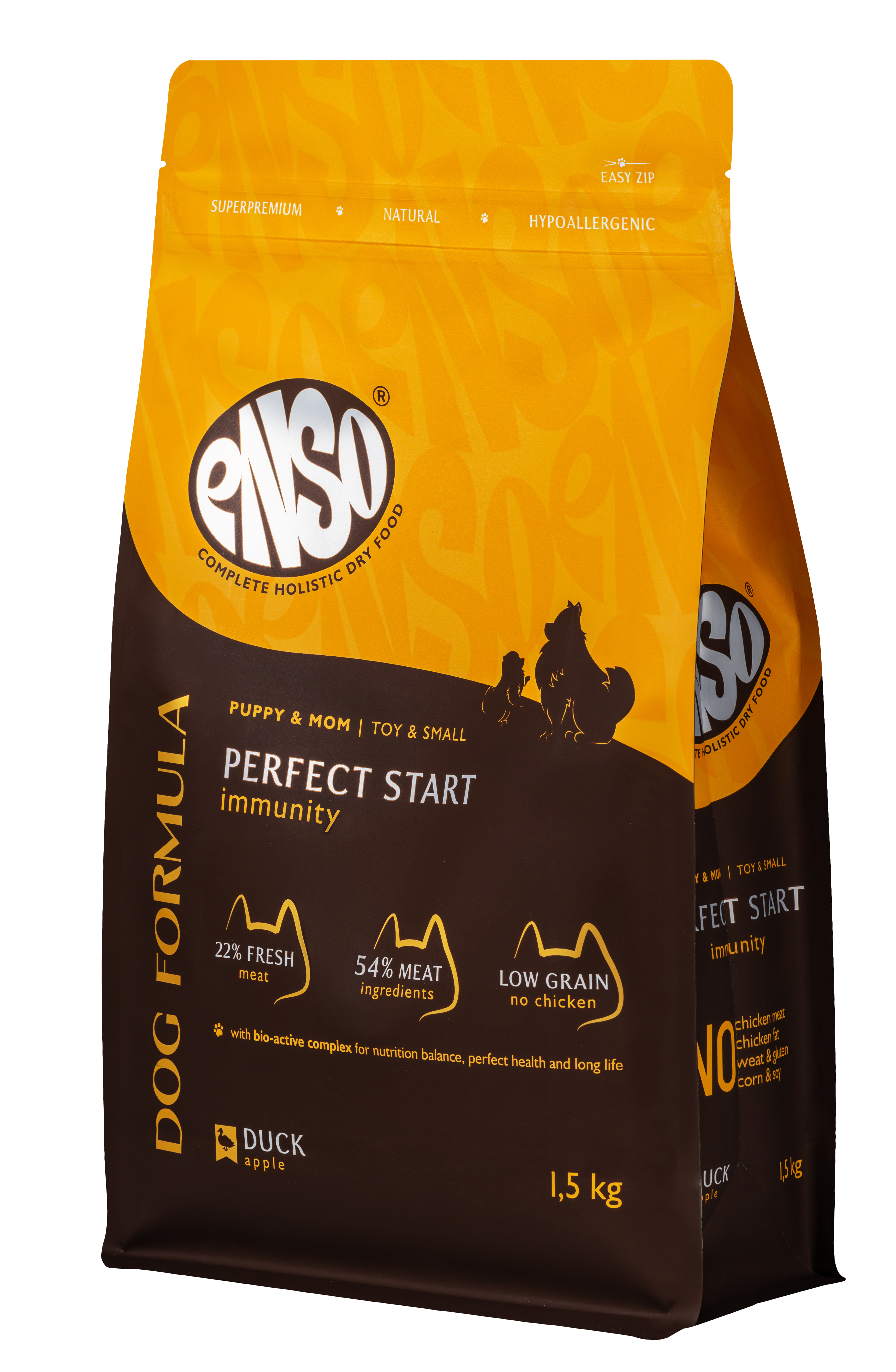 ENSO Dog formula Perfect start – сухой полнорационный корм для щенков от 1 месяца, беременных и кормящих собак мелких и миниатюрных пород со свежей уткой с добавлением яблок